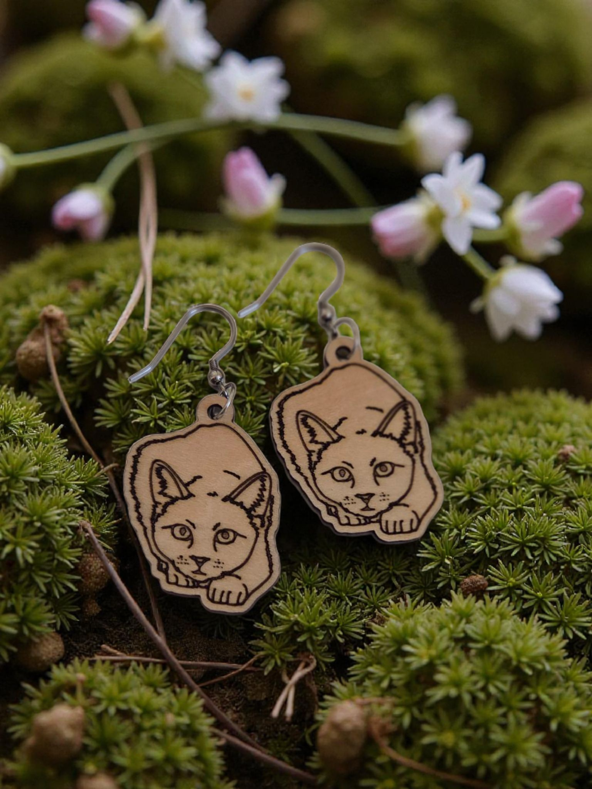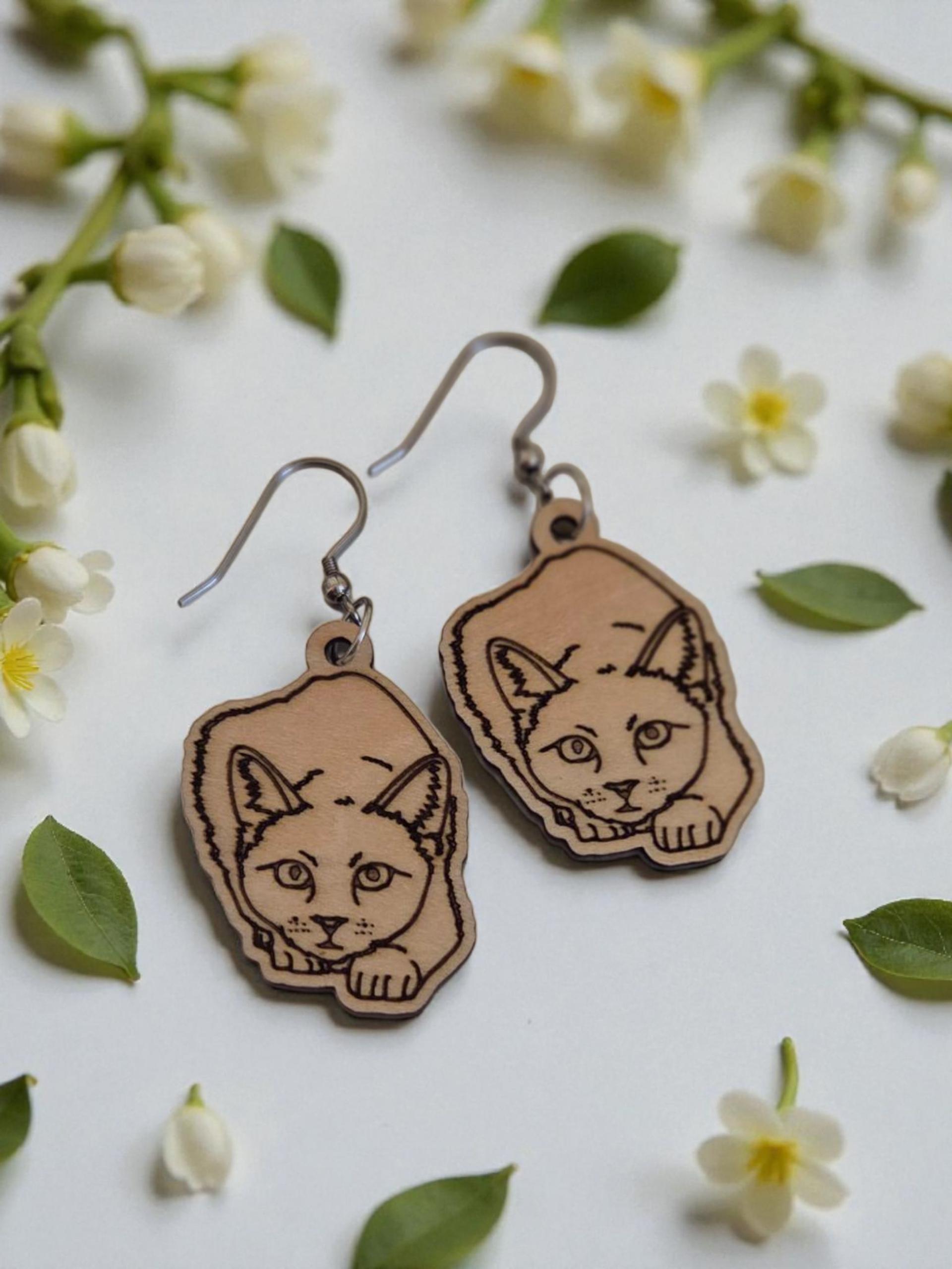 Adorable cat earrings handcrafted from lightweight basswood with secure stainless steel hooks—perfect for feline lovers of all ages. Each pair features detailed engraving and measures 1.13" wide by 1.50" tall, extending 2.25" from the hooks for an eye-catching dangle. Arrive beautifully gift-wrapped and ready to impress. Comfortable to wear all day while making a charming statement that celebrates your love for cats.