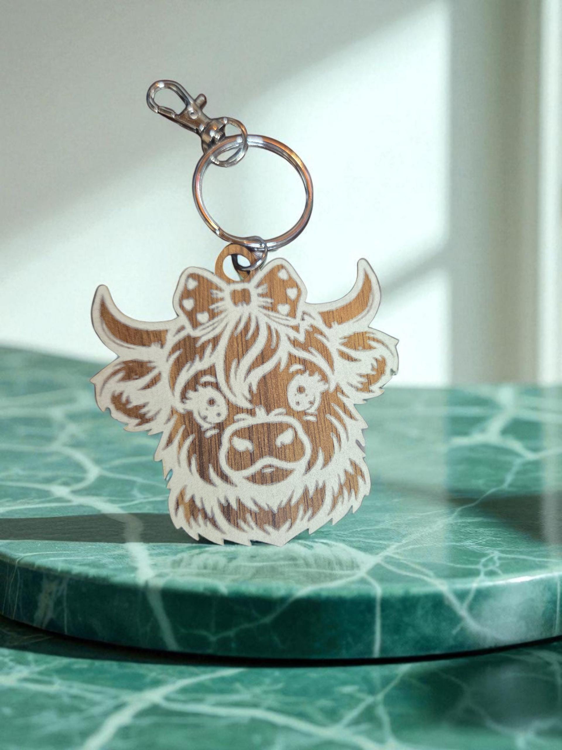 Engraved Walnut Highland Cow Keychain: Rustic Bag Charm