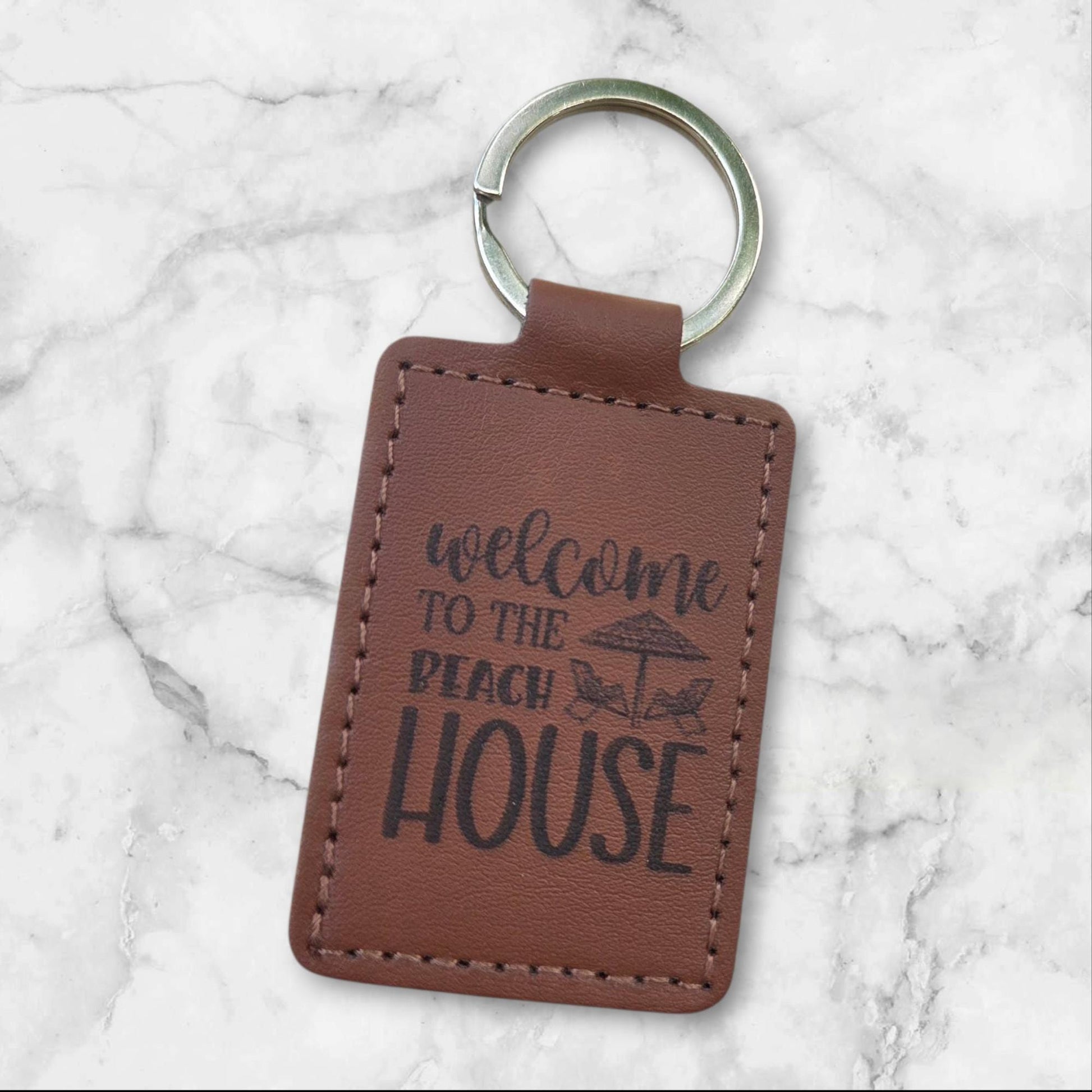 Faux Leather Beach House Keychain: Engraved Welcome Keyring