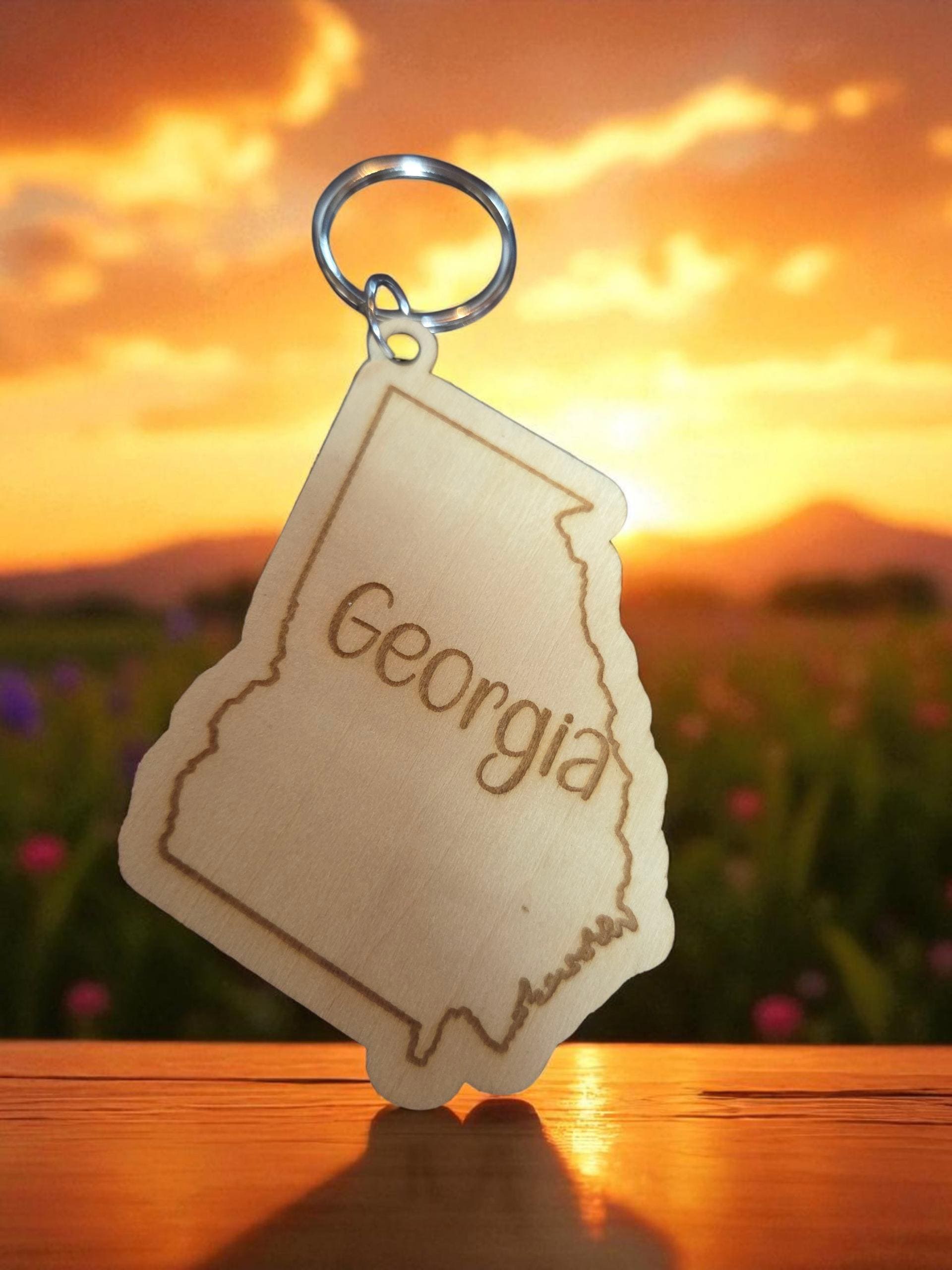 Show your state pride with this beautifully engraved Georgia-shaped wooden keychain. Featuring the word “Georgia” elegantly engraved on a precision-cut silhouette of the state, this accessory is a perfect keepsake or gift for anyone who loves the Peach State.