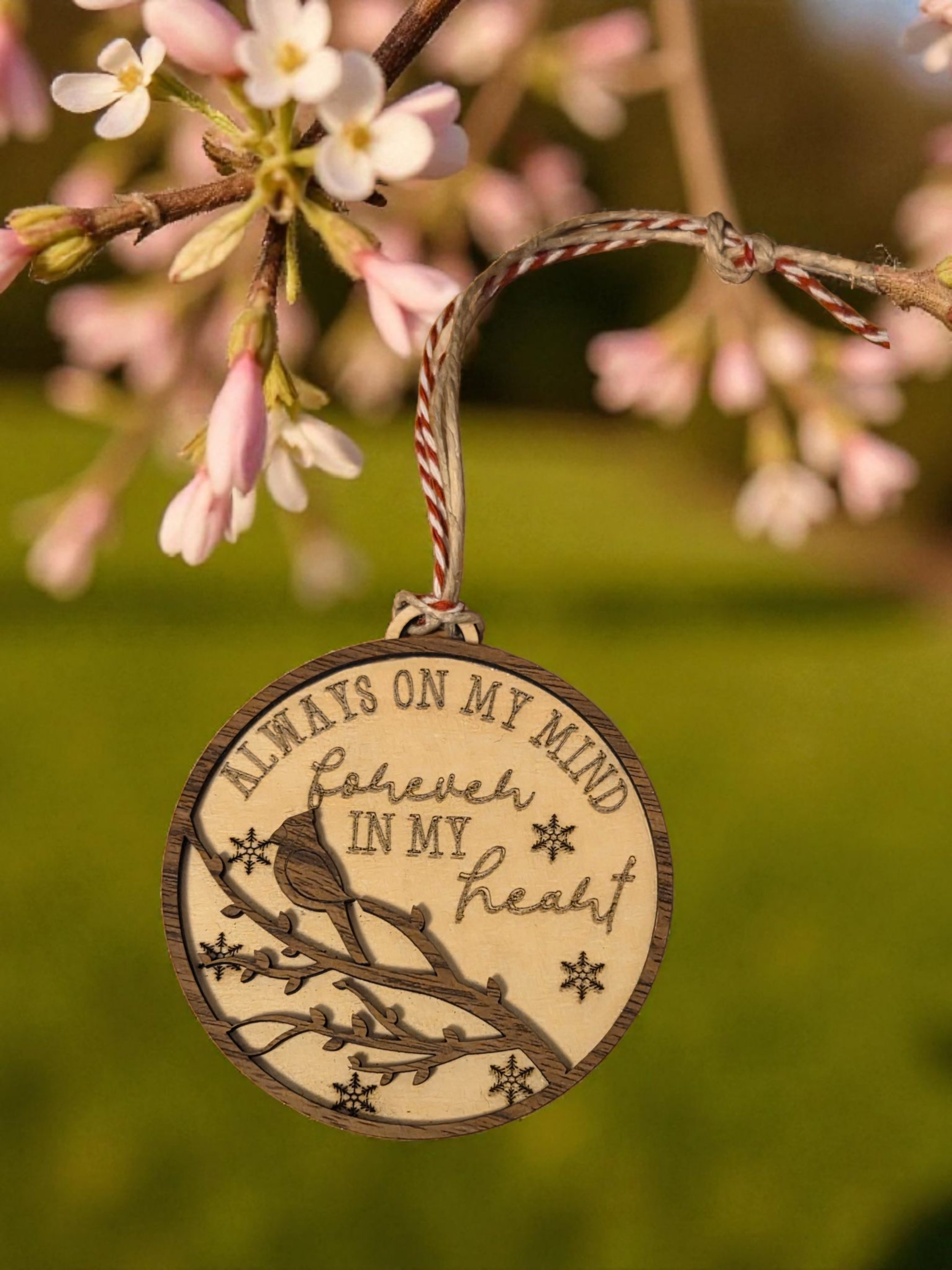 This beautifully crafted ornament features the heartfelt phrase "Always on my mind, forever in my heart," engraved on a piece of natural basswood. A stunning walnut wood cardinal perched on a branch adds a meaningful touch. Perfect for hanging on your Christmas tree, car mirror, or as a thoughtful gift. This ornament is 4 inches long by 3 3/4 inches wide and comes with a red and white hemp cord for easy display.
