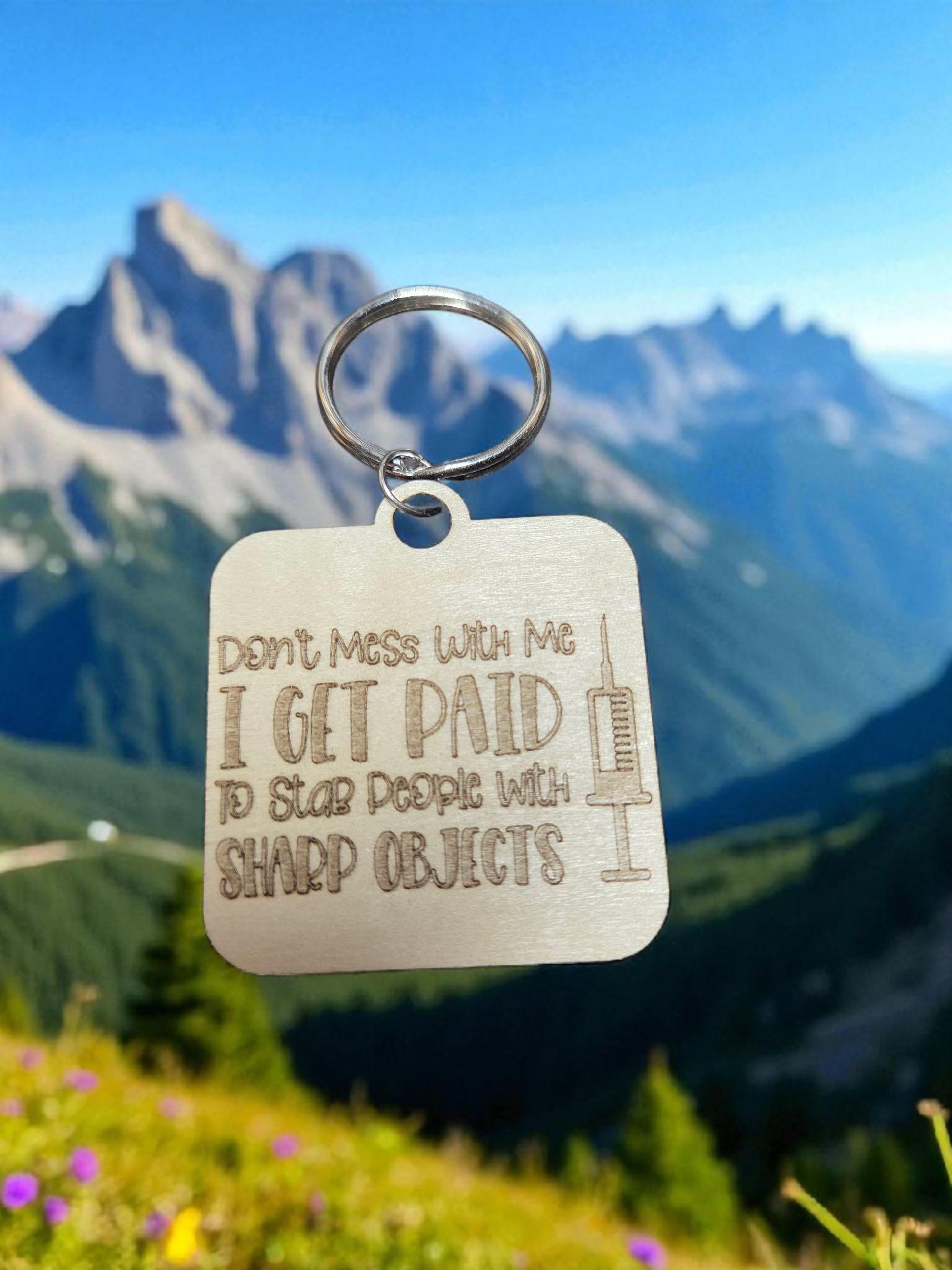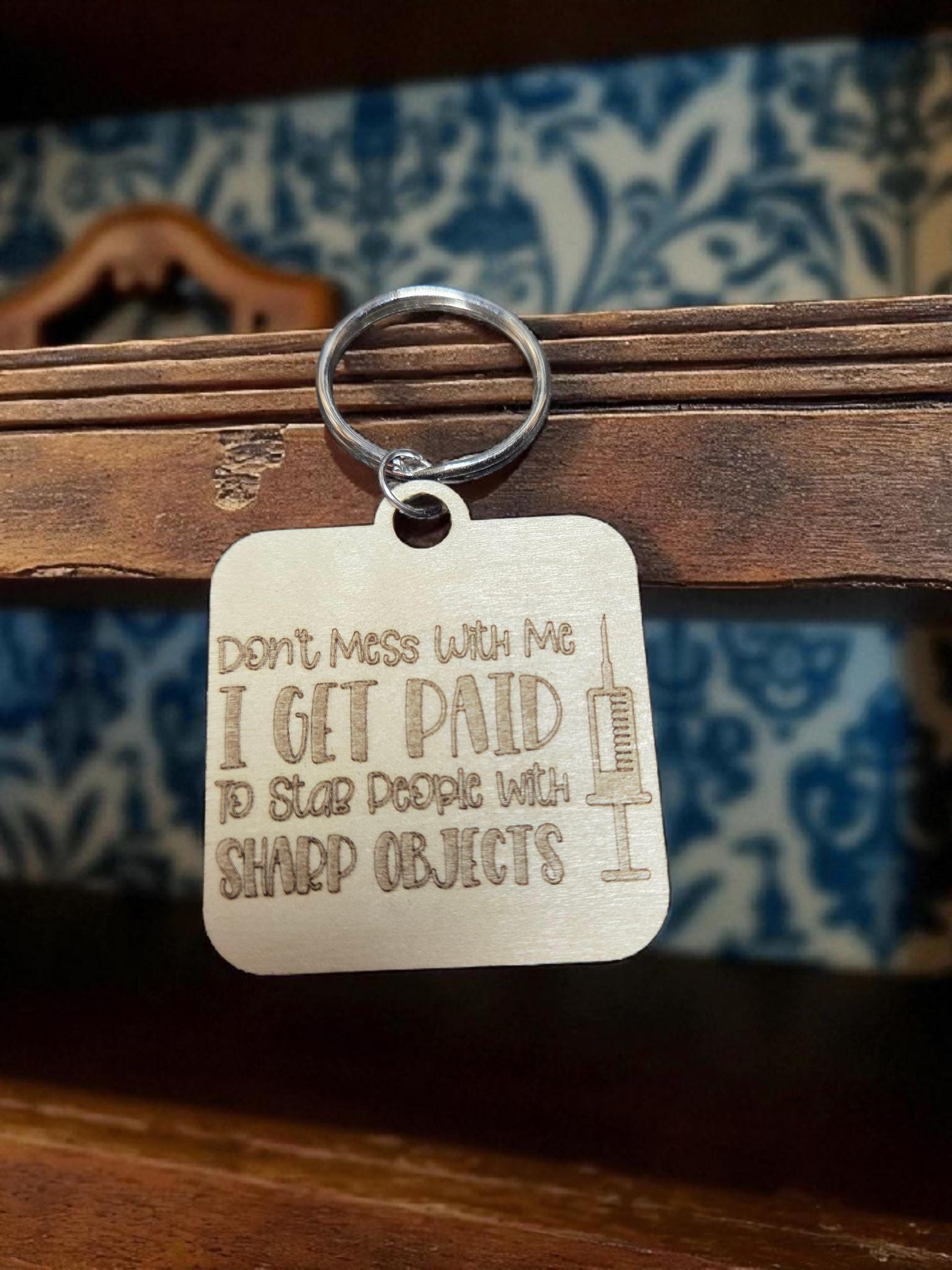 This engraved nurse keychain boldly declares, "Don't mess with me, I get paid to stop people with sharp objects." Crafted on a 2-inch wide square basswood with a silver keyring, it’s a perfect gift for nurses or phlebotomists who take pride in their vital, hands-on work. Durable and eye-catching, it’s a daily reminder of their important role and a fun way to show off their professional edge.