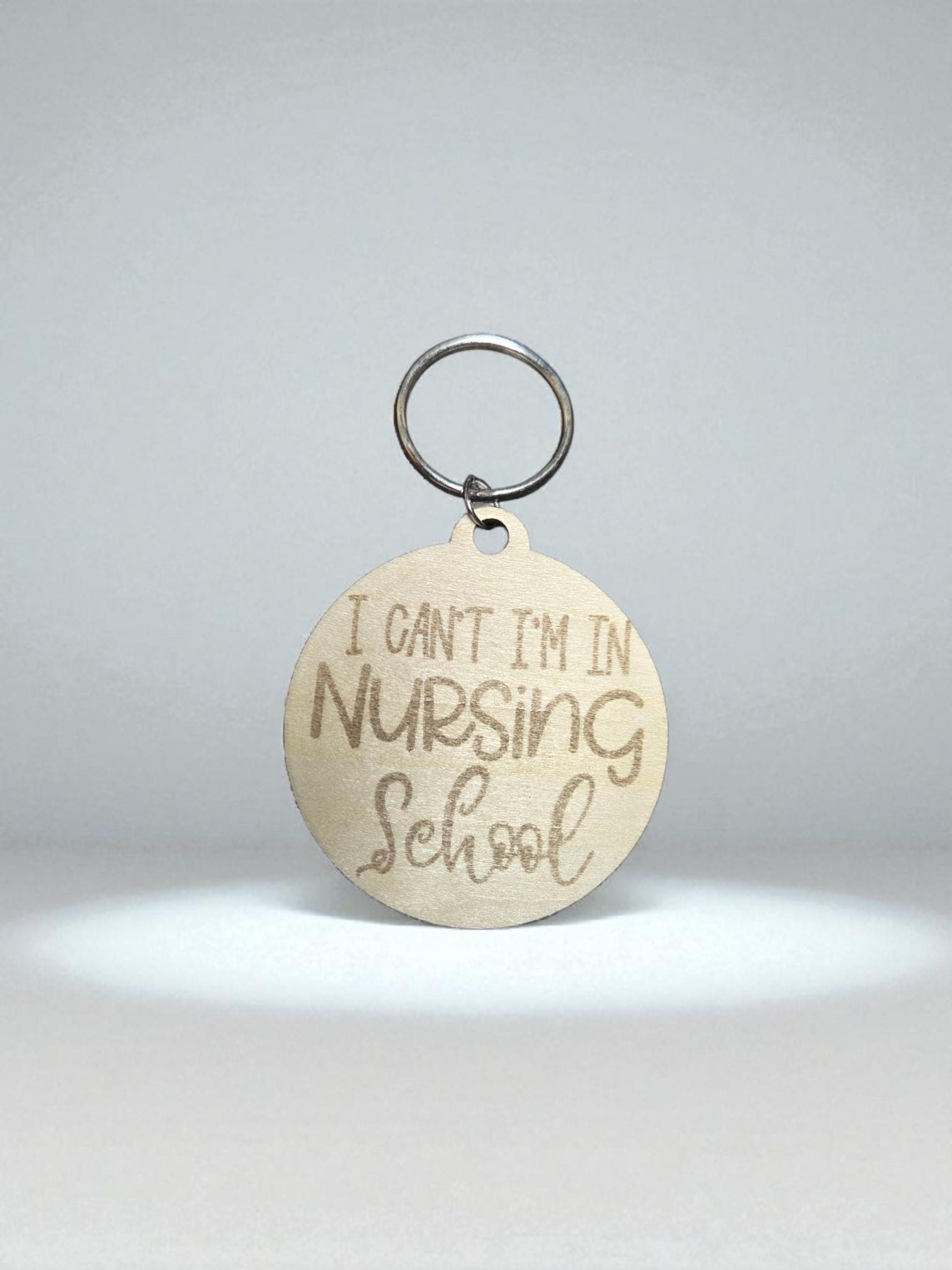 Celebrate dedication with this Nursing School Keychain, featuring the phrase "I can't I'm in Nursing School" engraved on a smooth, circular basswood pendant. Paired with a sturdy silver keyring, it’s a perfect daily reminder of commitment and hard work. Lightweight and durable, this keychain makes an ideal gift for nursing students or a motivational accessory for yourself.