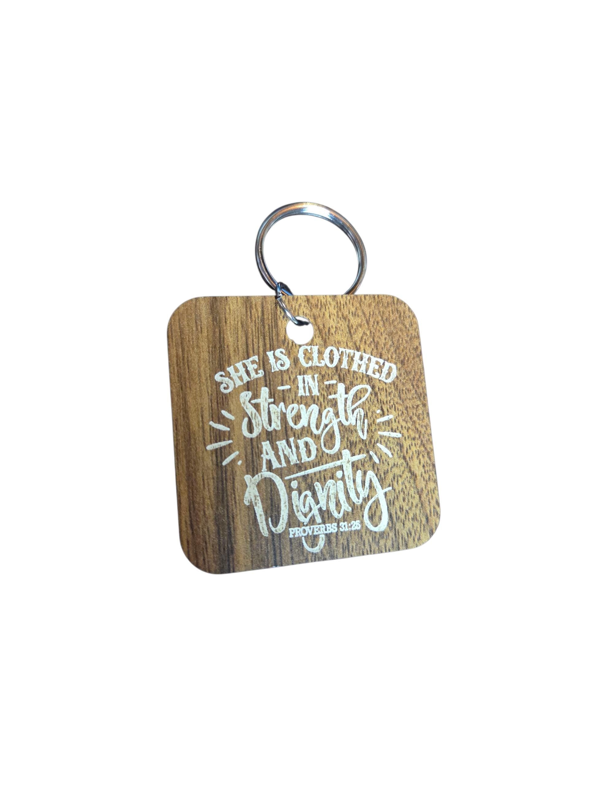 Proverbs 31 Keychain – “She is Clothed in Strength and Dignity” | Walnut Wood, 2" Square, Silver Keyring