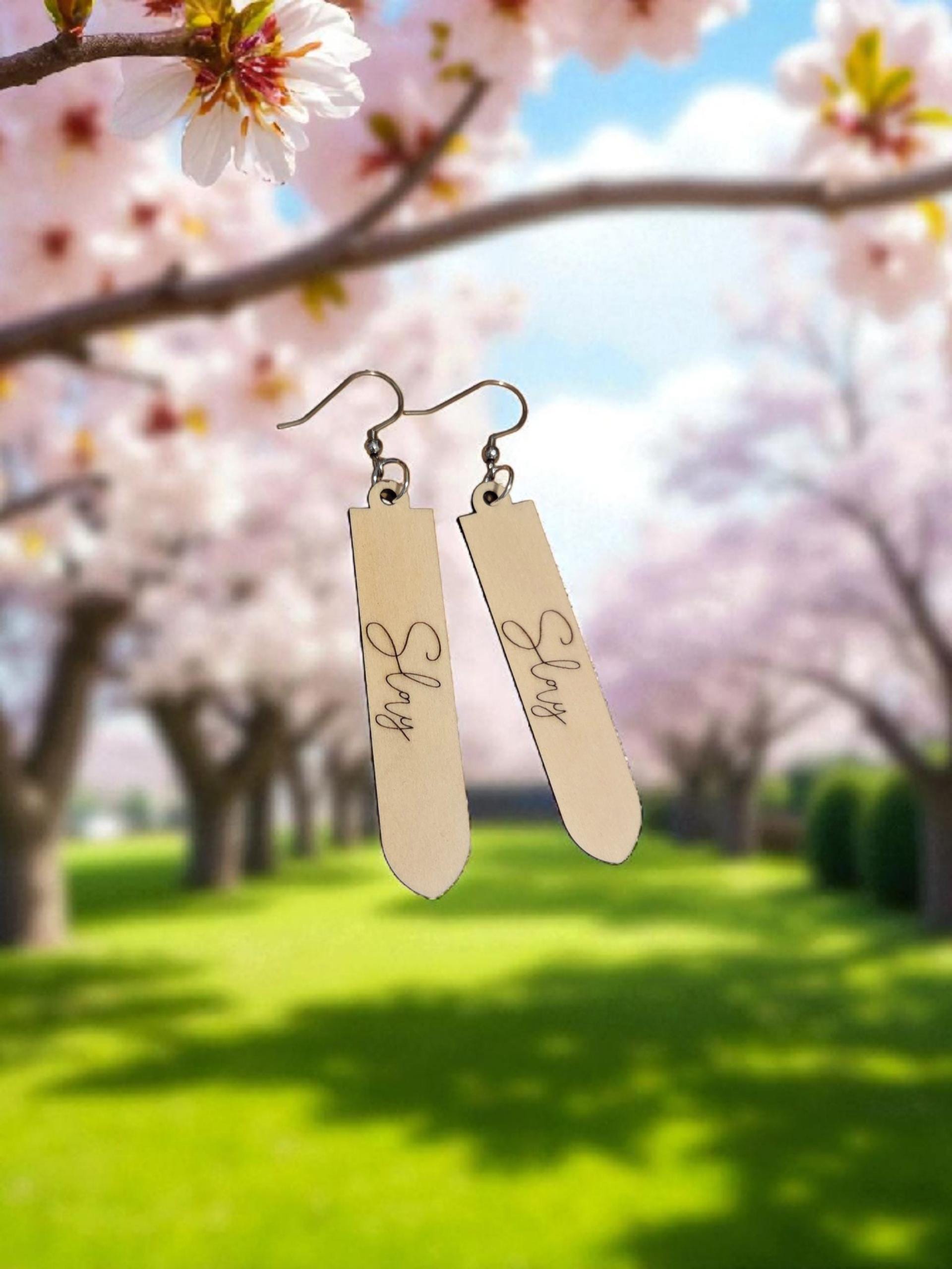 Fierce and bold, these wood earrings are laser engraved with “Slay.” Each piece measures 3 3/8" long by 1/2" wide and comes gift-ready. Lightweight, stylish, and perfect for statement wear or as a unique gift.