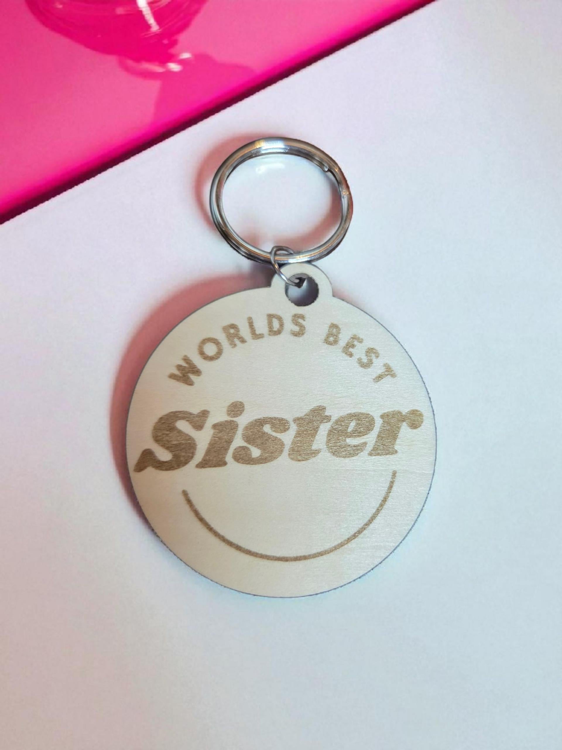 Celebrate the bond only sisters share with this heartfelt “World’s Best Sister” keychain. Expertly engraved on natural basswood, it measures 2.5 inches wide, making it a perfect keepsake that’s both lightweight and durable.